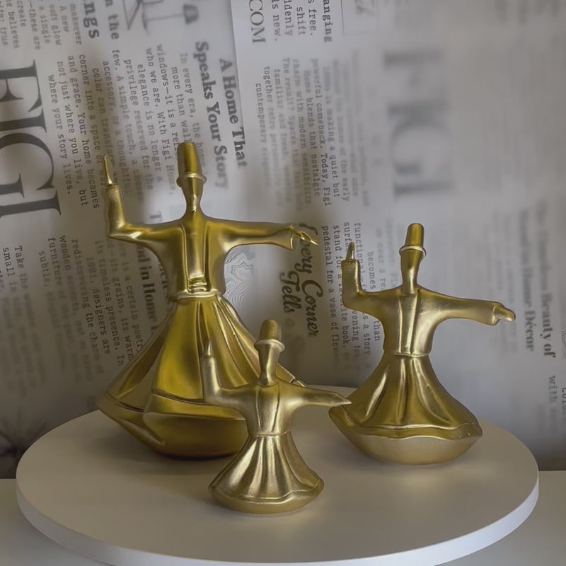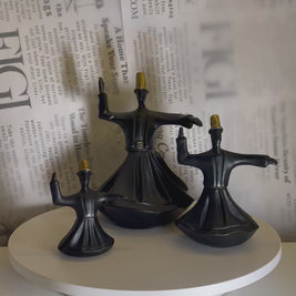 This elegant three-piece dervish figurine set brings movement, culture, and artistry into your space. Each figure captures the iconic whirling pose with flowing robes and uplifted arms, finished in a sleek matte black with subtle gold detailing on the headpiece. Displayed together, they create a beautifully balanced scene that adds depth and serenity to shelves, consoles, or tabletop arrangements.