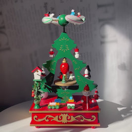 The Wooden Rotating Christmas Tree Decoration brings classic holiday charm to life through handcrafted detail and motion. Designed with a traditional festive palette of green, red, and gold, this piece features miniature Santas, snowmen, and gifts surrounding a central rotating tree — topped with a wooden propeller that gently spins when the air flows around it.